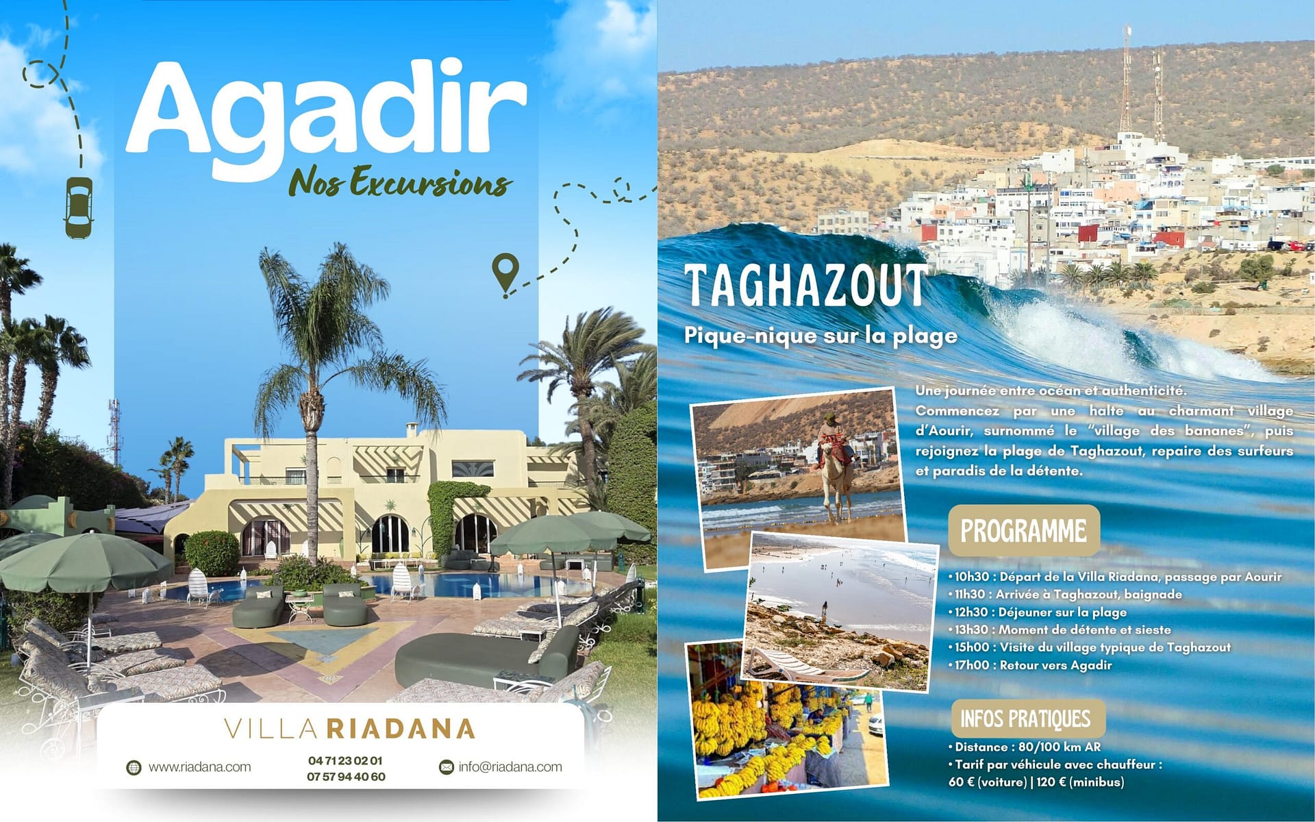 Demandez notre livret d’excursions sur place, incluant les visites incontournables et proches d’Agadir, ainsi que les activités à faire sur Agadir