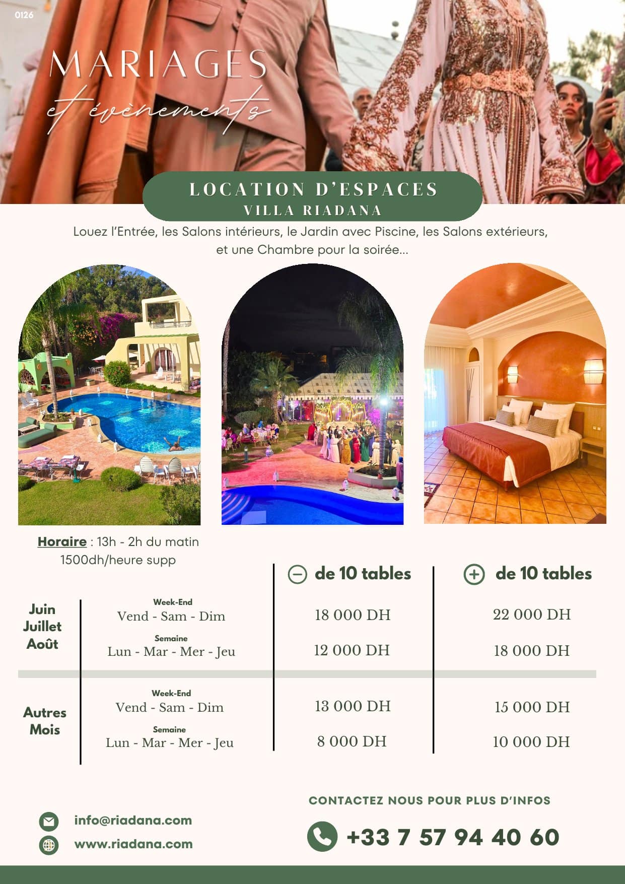 La Villa Riadana, c’est à l’origine 11 suites junior, un grand salon marocain avec cheminée, une tente de réception, une salle de séminaire, un grand spa et une piscine chauffée.
