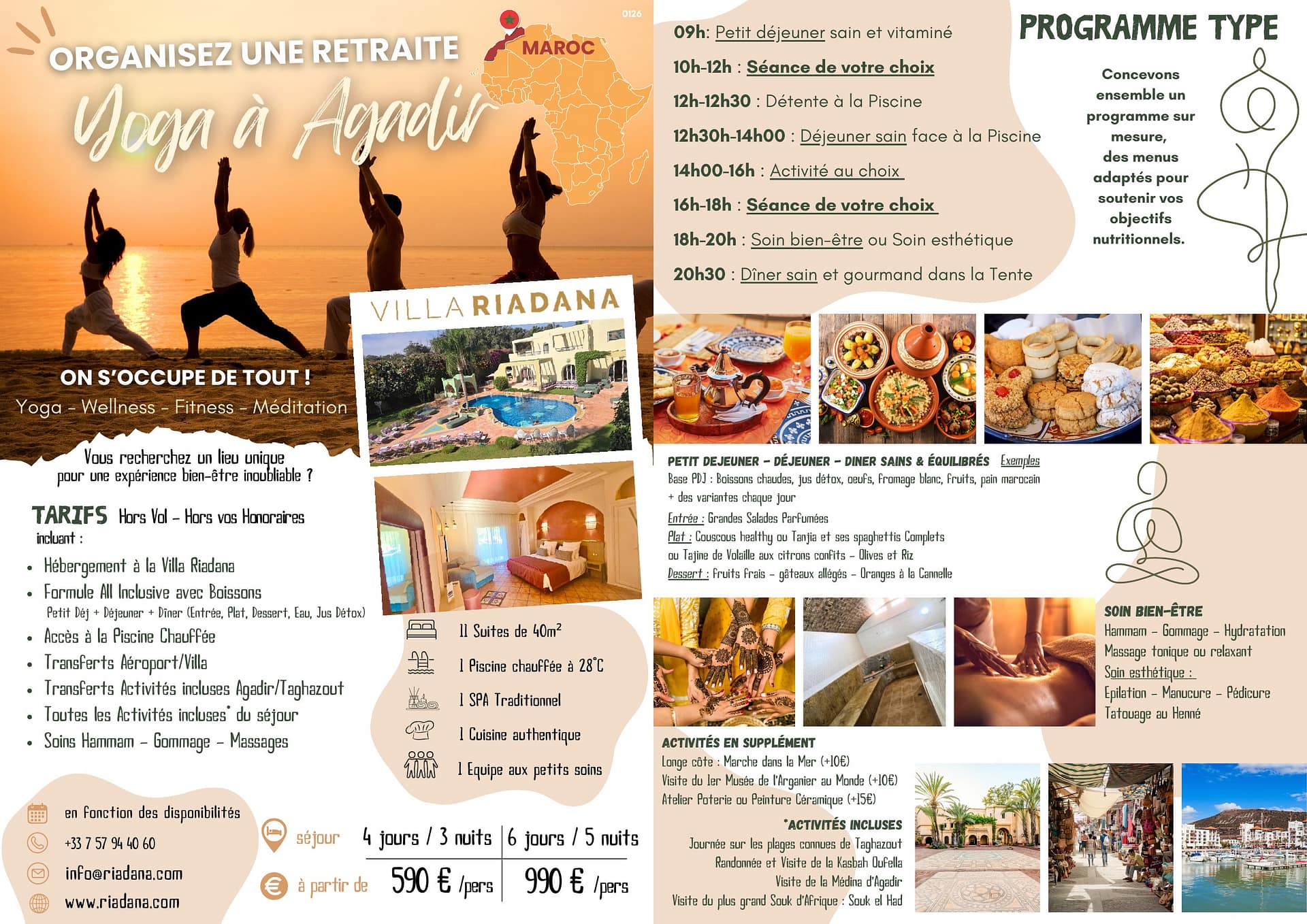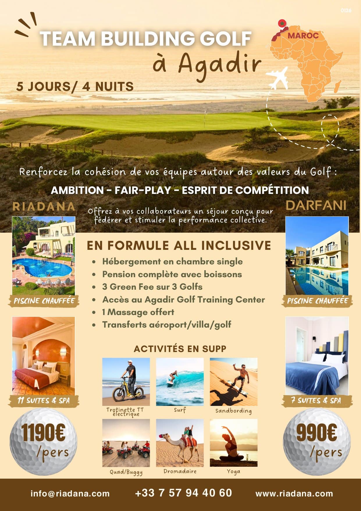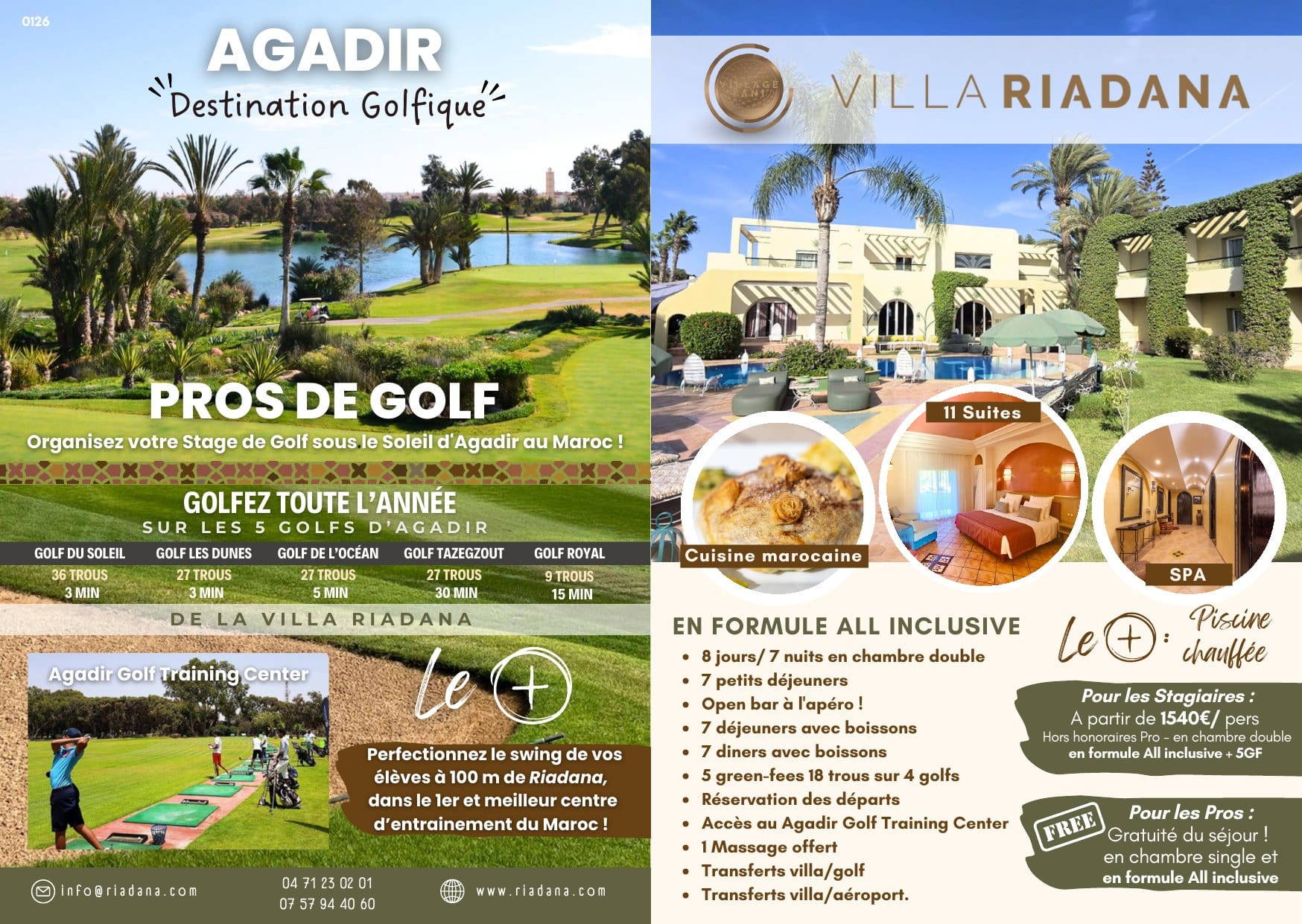 Nous avons passé une semaine exceptionnelle à la Villa Riadana pour un stage de golf bien intense. Tout était parfait! L’accueil d’Abdou et de Christine est chaleureux, la cuisine est raffinée et très variée : nous avons goûté tous les jours des spécialités marocaines différentes dont Abdou nous racontait l’histoire, un vrai régal à tous les niveaux! Les chambres sont spacieuses avec des lits king size, propres et bien meublées, elles ont toutes une terrasse donnant sur la piscine chauffée au bord de laquelle il fait bon se prélasser ou travailler selon les goûts! Le personnel est vraiment accueillant et souriant. Soumia nous a organisé d’un claquement de doigts une séance de surf mémorable sur la plage d’Agadir mais aussi un beau gâteau d’anniversaire !