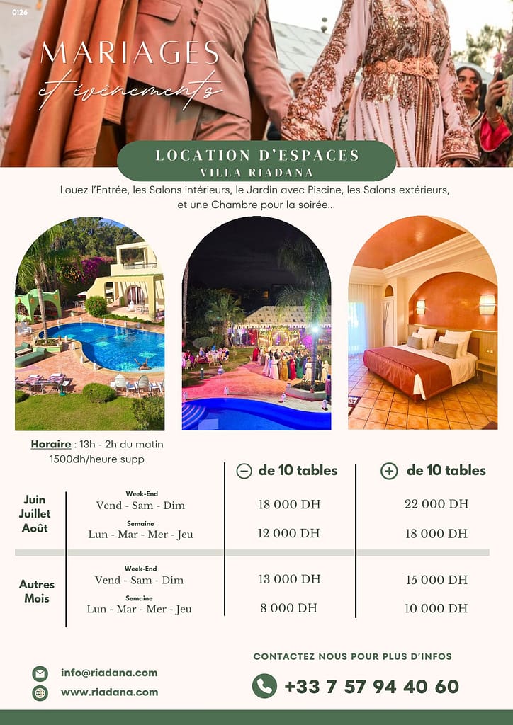 Oui, la Villa Riadana est disponible pour des soirées, mariages et événements privés, avec possibilité de traiteur extérieur.